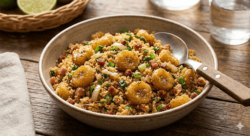 A farofa de banana é uma verdadeira explosão de sabores, unindo o doce natural da banana à crocância da farinha de mandioca tostada. É o acompanhamento perfeito para dar um toque especial a qualquer refeição, desde um almoço rápido até um churrasco de domingo.